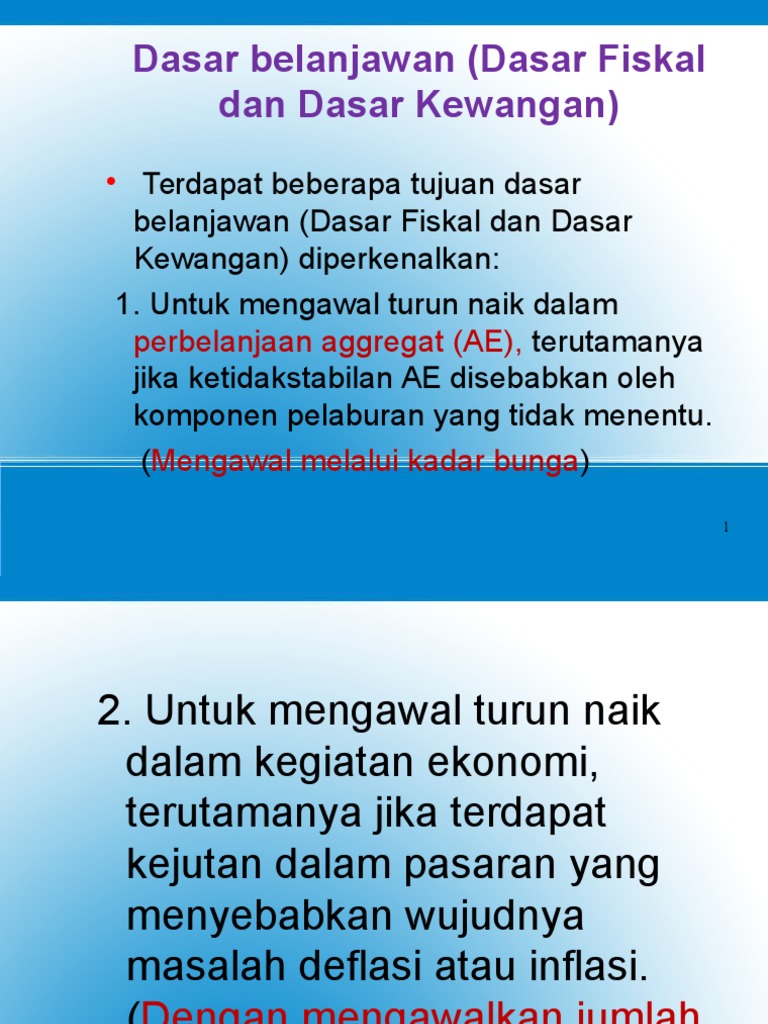 G Dasar Belanjawan Fiskal 1 from imgv2-1-f.scribdassets.com Dasar fiskal bertujuan mencapai tingkat guna tenaga penuh dan mengawal inflasi. Ekonomi rusia adalah ekonomi terbesar kesepuluh di dunia mengikut nilai ukuran dasar dan keenam terbesar mengikut pariti kuasa beli (pbk). Dasar kewangan telah menjadi jenis rangsangan ekonomi yang paling popular sejak krisis kewangan global 2008. Dasar monetari ialah pengurusan kadar faedah dan jumlah bekalan wang dalam edaran. Lim guan eng tidak layak jadi menteri kewangan (part 3) orang cina mula geram dengan bangsa dap lim kit. Dasar fiskal atau belanjawan b. Setiap hari kita mendengar beberapa berita mengenai perubahan dalam dasar fiskal kerajaan. Permintaan aggregat tingkat harga umum.